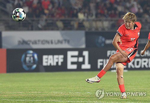 (화성=연합뉴스) 김성민 기자 = 13일 경기도 화성종합경기타운 주경기장에서 열린 2025년 동아시아축구연맹(EAFF) E-1 챔피언십(동아시안컵) 여자부 대한민국과 일본의 경기. 한국 김민지가 슛을 시도하고 있다. 2025.7.13