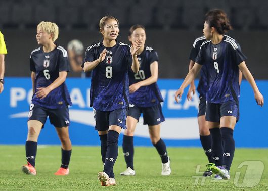 (화성=뉴스1) 김진환 기자 = 13일 오후 경기 화성시 향남읍 화성종합경기타운에서 열린 2025 동아시아축구연맹(EAFF) E-1 챔피언십 여자부 대한민국과 일본의 경기, 전반 일본의 유이 나루미야(8번)가 선취골을 넣은 뒤 벤치를 향해 손뼉을 치고 있다. 2025.7.13/뉴스1