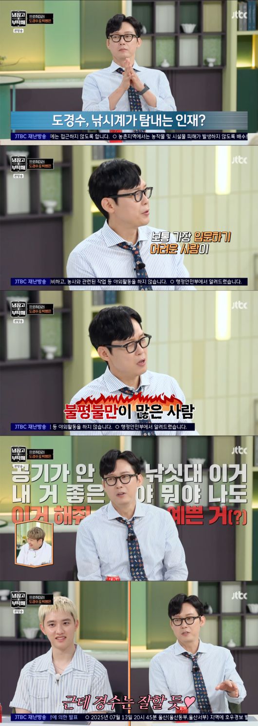 박병은은 도경수를 두고 낚시계가 탐나는 인재라고 언급하며 “경수는 차분한 성격에 불평불만이 없다. 가장 입문하기 힘든 사람이 불평불만이 많은 사람이다. 가장 스트레스가 ‘고기 왜 안 잡혀’(라고 말하는 사람)”라고 말해 웃음을 자아냈다.