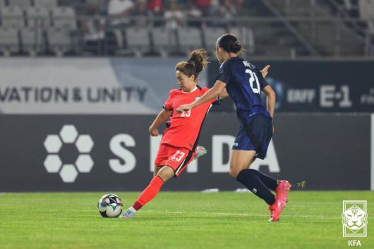 한국이 아쉬움을 삼켰다. 전반 20분 지소연의 패스가 튀면서 뛰어나온 일본 골키퍼가 처리하지 못했다. 김민지에게 슈팅 찬스가 왔고 왼발로 때렸는데 높게 떴다. 전반 25분 김민지의 왼발 슈팅은 또 높게 떴다.