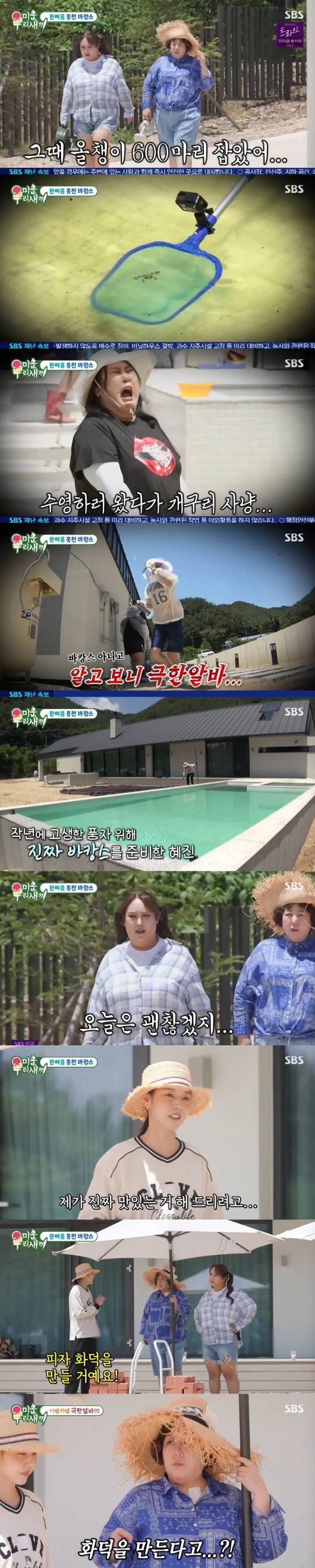 풍자는 "내가 여기서 올챙이 600마리 잡았다니까"라고 말했다. 수영장을 보며 신기루, 풍자가 바로 들어가면 되냐고 묻자 "올해 첫 개장이다"라고 이야기해 기대감을 높였다. 곧이어 한혜진은 벽돌을 가져와 의아함을 자아냈고, 풍자는 "집을 또 지을 거야?"라고 물었다. 이에 한혜진은 "피자 화덕을 만들 거다"라고 이야기했다. 무더위에 화덕피자를 만들 거라는 얘기에 풍자는 "전자레인지에 돌리면 되잖아"라고 했고, 한혜진은 "낭만이 없잖아"라고 이야기해 웃음을 더했다.