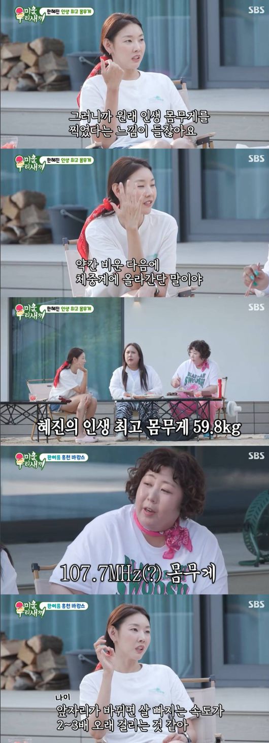 한혜진은 "확실히 앞자리가 바뀌면 살빼는 속도가 2~3배 오래 걸리는 것 같다. 아예 빠지지도 않는다"라고 이야기했다.