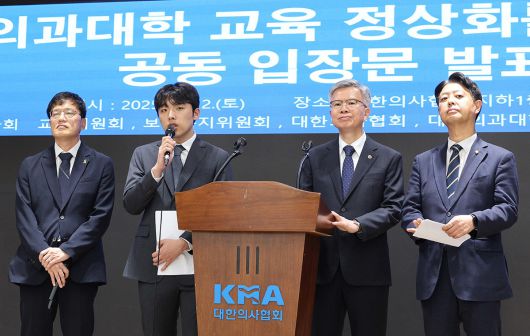 박주민 보건복지위원장(왼쪽부터), 이선우 대한의과대학·의학전문대학원학생회 비상대책위원장, 김영호 국회 교육위원장, 김택우 대한의사협회장이 12일 오후 서울 용산구 대한의사협회에서 의과대학 교육 정상화를 위한 공동 성명서를 발표하고 있다. 윤석열 정부의 의과대학 정원 확대 추진 등 의료 개혁 정책에 반발해 학교를 떠났던 의대생들이 전원 복귀하겠다는 뜻을 밝혔고 국회는 의대 교육의 정상화를 적극 지원하겠다고 약속했다. 뉴스1 |