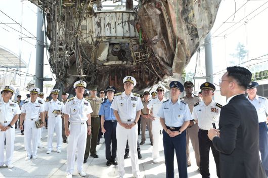 김명수 합참의장과 댄 케인 미국 합참의장, 요시다 요시히데 일본 통합막료장이 11일 제22차 한미일 합참의장 회의 종료 후 경기도 평택 해군2함대사령부를 방문해 천안함 선체 설명을 듣고 있다./합참 |