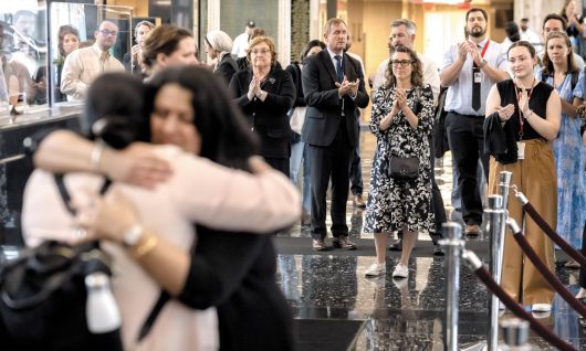 11일 미 워싱턴 DC의 해리 S 트루먼 빌딩의 국무부 청사 로비에서 국무부 직원들이 떠나는 동료를 환송하며 박수를 치고 있다. 미 국무부는 이날 외교관·직원 등 1300여 명에게 해고를 통보했다. 트럼프 행정부는 정부 효율성을 높이고자 대대적인 조직 개편과 인력 감축을 진행한다는 입장이다. 그러나 야당인 민주당은 “중국의 영향력이 커지고, 러시아의 우크라이나 공격이 계속되며, 중동이 위기에 휩싸인 시점에 이보다 더 어리석은 결정은 없을 것”이라고 비판했다.