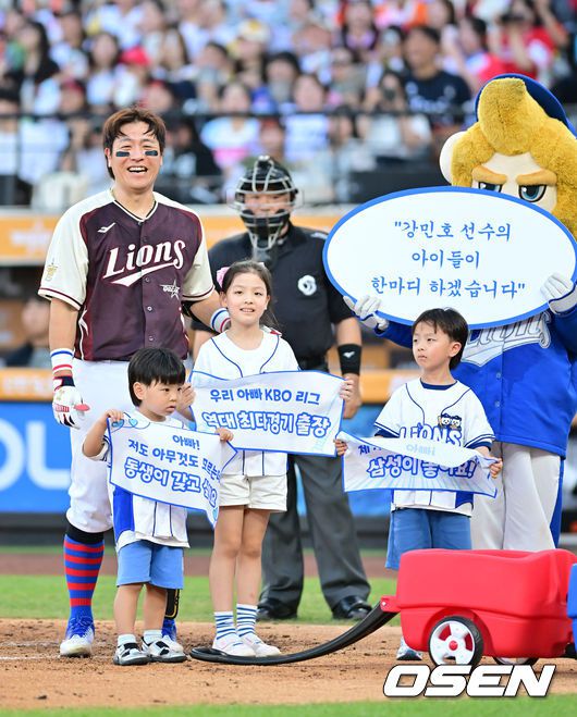 2회초 2사 삼성 강민호가 자녀들과 함께 퍼포먼스를 보이고 있다. 2025.07.12 / soul1014@osen.co.kr