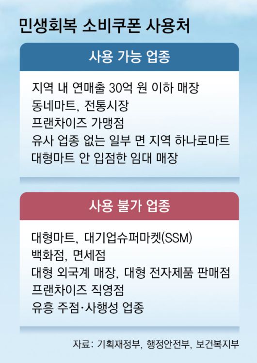 지역 민생경제 회복 취지에 맞춰 사용 지역은 주소지 관할 지방자치단체 내 매장으로 제한된다. 지역사랑상품권과 신용·체크카드 등으로 발급이 가능하며, 연 매출 30억 원 이하 소상공인 사업장에서 사용할 수 있다. 주요 사용처는 전통시장, 동네마트, 식당 등과 더불어 일부 프랜차이즈 가맹점으로 대형마트, 대기업슈퍼마켓(SSM), 백화점, 온라인 쇼핑몰에서는 이용이 불가능하다.