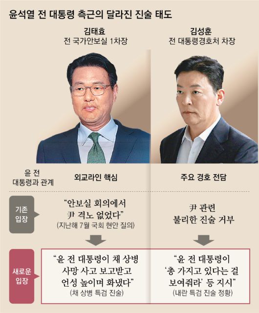 윤석열 전 대통령이 10일 구속된 가운데 윤 전 대통령의 ‘복심(腹心)’으로 알려졌던 측근들이 기존 입장을 번복하고 있다. 특히 윤석열 정부 외교안보·경호 라인의 실세로 알려진 김태효 전 국가안보실 1차장과 김성훈 전 대통령경호처 차장이 최근 진행된 특검 조사에서 윤 전 대통령에게 불리한 진술을 내놓은 것으로 알려졌다. 윤 전 대통령이 자신의 처지를 ‘고립무원’이라고 표현한 것처럼 관련자들의 진술이 하나둘씩 바뀌면서 특검 수사도 급물살을 탈 것으로 보인다.