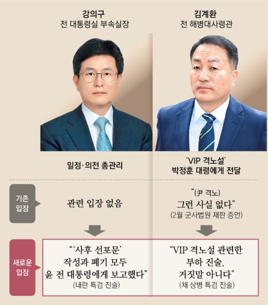 윤 전 대통령의 일정 등 의전을 총괄 관리했던 강의구 전 대통령실 부속실장은 이른바 ‘사후 계엄 선포문’과 관련해 “문서 작성과 폐기 모두 윤 전 대통령에게 보고했다”는 취지로 진술한 것으로 알려졌다. 그는 윤 전 대통령 변호인과 함께 조사를 받을 땐 “문건을 폐기한 후 윤 전 대통령에게 보고했다”며 자신에게 책임이 있다는 취지로 진술했다고 한다.