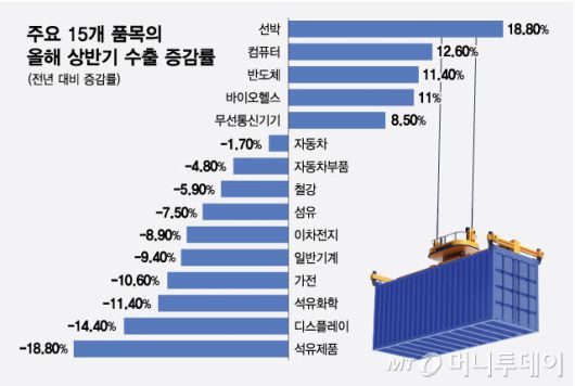 주요 15개 품목의 올해 상반기 수출 증감률/그래픽=최헌정 |