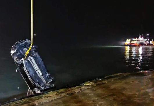 지난달 2일 전남 진도군 임회면 진도항 인근 해상에서 일가족 탑승 차량이 인양되고 있다. 아내와 공모해 두 아들을 태우고 바다로 돌진한 40대 가장은 혼자서만 탈출해 광주로 달아났다 검거됐다. 목포해양경찰서 제공 |