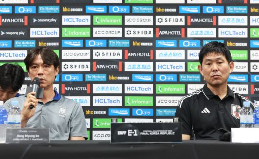 6일 경기도 용인미르스타디움에서 열린 2025년 동아시아축구연맹(EAFF) E-1 챔피언십(동아시안컵) 공식 기자회견에서 한국 홍명보 감독이 취재진 질문에 답하고 있다. 오른쪽에는 모리야스 하지메 일본 감독. 사진=연합뉴스 |