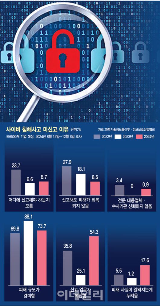 과학기술정보통신부와 한국정보보호산업협회(KISIA)가 올해 4월 발표한 ‘2024 정보보호 실태조사’에 따르면, 지난해 사이버 침해 사고를 겪은 기업 중 이를 관계 기관이나 수사기관에 신고한 비율은 19.6%에 그쳤다. 이는 전년 대비 11.1%포인트 증가한 수치지만, 여전히 낮은 수준이다.