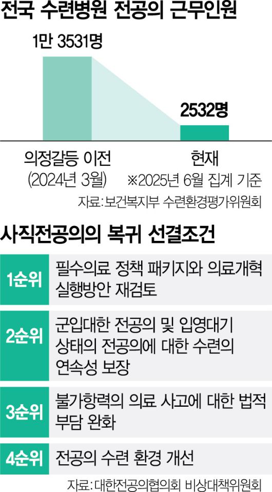 현재 전국에서 수련 중인 전공의는 총 2532명으로, 의정갈등 이전 1만3531명의 18.7% 수준에 불과하다. 사직 전공의들은 이달 말 공고될 하반기 모집을 통해 수련병원에 복귀할 수 있다. 다만 절반 이상이 일반의로 의료기관에 취업했고 일부는 수련을 포기해 의대생과 같은 전원 복귀는 어려울 것이란 전망이 나온다.