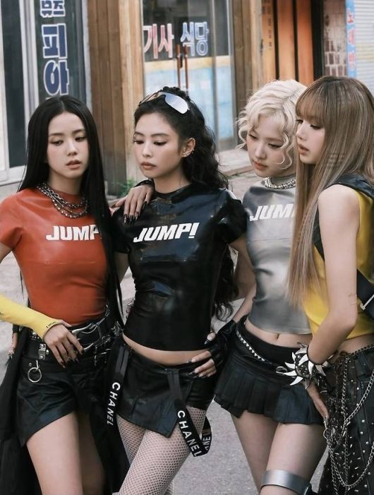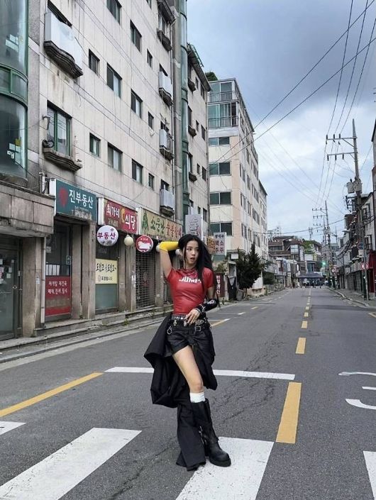 공개된 사진에서 지수는 한적한 거리의 횡단보도 위에서 모델 포스를 발산했다. 레드 타이트 탑에 ‘JUMP!’라고 적힌 프린팅, 그리고 블랙 레더 쇼츠. 의도적으로 한쪽 바지를 풀어내린 듯한 스타일링은 자유와 무드를 동시에 안겼다.