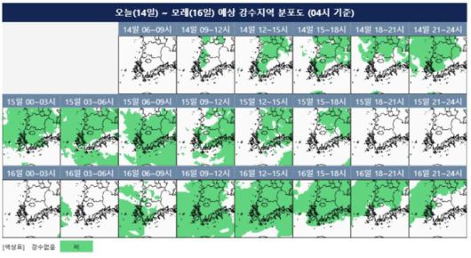 오는 16일 오전에도 비가 내릴 것으로 예보됐다. 예상강수량은 10~40㎜다.