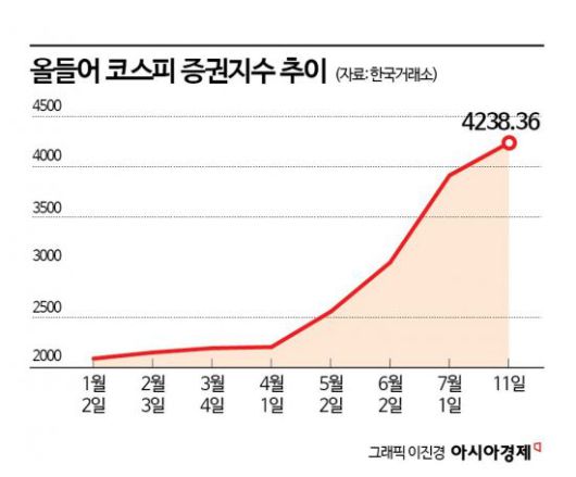 증권주들의 신고가 행진에 코스피 증권지수는 이달 9.74% 상승했다. 같은 기간 3.39% 오른 코스피를 큰 폭으로 웃도는 수준이다. 연초 대비로는 102.89%나 올랐다. 같은 기간 코스피는 32.38% 상승했다.