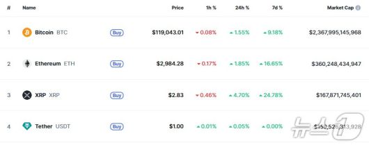 (서울=뉴스1) 박형기 기자 = ‘암호화폐 주간’을 맞아 비트코인이 11만9000달러를 돌파하자 알트코인(비트코인 이외 암호화폐)도 일제히 랠리하고 있다.