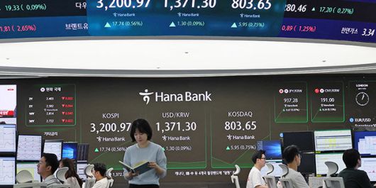 11일 오전 서울 중구 하나은행 딜링룸에 코스피와 코스닥, 원달러환율이 표시되고 있다. 코스피 3200선 돌파는 지난 2021년 9월 6일(장중 3206.25) 이후 약 3년 10개월 만이다. 2025.7.11 뉴스1 |
