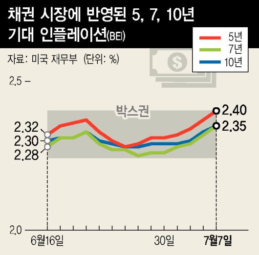 기대 인플레이션은 지난해 말부터 올해 초까지 큰 폭으로 상승했다. 연말 연초 물가 불안에 관세 이슈가 중첩된 데 따른 상승이었다. 하지만 해당 지표는 5월 이후 안정을 찾아 이제 박스권에서 제한적인 등락을 보인다. 이는 시장에서는 기대 인플레이션이 크게 흔들리지 않고 있음을 시사한다. 파월 의장이 계속해서 인하에 대해 불확실한 태도를 보이고 있음에도 시장에서 하반기 기준금리 인하 재개 전망이 차츰 강화되는 이유다.