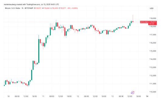 비트코인 가격 추이. 13일(현지시간) 한때 11만9444달러 기록. 출처 코인텔레그래프 |