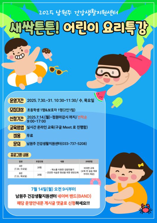 [스포츠서울ㅣ원주=김기원기자]남원주건강생활지원센터는 여름방학을 맞아 오는 30일과 31일, 2일간 초등학생의 건강한 식습관 형성을 위한 ‘새싹튼튼! 어린이 요리특강’ 프로그램을 운영한다.