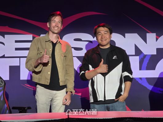 라이엇 게임즈 브렛 라우튼바흐 글로벌 프로덕트 전략 담당(왼쪽)과 피유 리우 리그 스튜디오 게임 디렉터가 인터뷰 후 기념촬영을 하고 있다. 밴쿠버=김민규 기자 kmg@sportsseoul.com |
