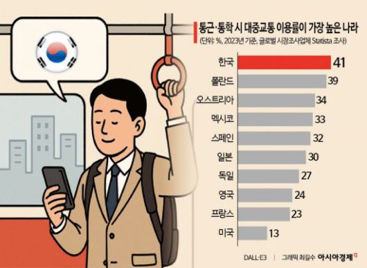 글로벌 시장조사업체 스태티스타에 따르면 2023년 기준 한국의 대중교통 이용률은 41%다. 폴란드(39%), 오스트리아(34%), 일본(30%) 등을 제치고 세계 1위다. 최근 기후동행카드가 도입되면서 이용률은 더욱 오를 전망이다.