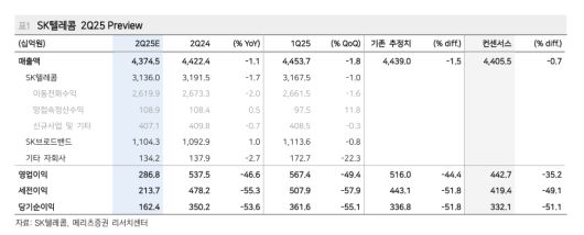 2025년 전체 연결 실적은 매출액 17조2739억 원(전년비 -3.7%), 영업이익 1조2070억 원(전년비 -33.8%)으로 전망된다. 이 중 SK텔레콤 별도 기준 영업이익은 8086억 원(전년비 -46.9%), SK브로드밴드는 3747억 원(전년비 +6.3%)을 기록할 것으로 예상된다.
