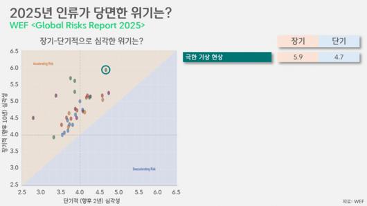 홍수나 폭염 등 극한 기상 현상은 장기적(향후 10년)으로나, 단기적(향후 2년)으로나 '가장 심각한 위기'로 꼽혔습니다. WEF(World Economic Forum, 세계경제포럼)가 해마다 내놓는 〈글로벌 위기 보고서〉에 담긴 결과입니다. 이는 장기적 및 단기적으로 위기별 심각성을 1~7점 척도로 매겨 전 세계의 사회 각계각층을 상대로 조사한 것으로, 극한 기상 현상은 장기 5.9점, 단기 4.7점으로 다른 모든 위기를 넘어설 만큼 심각한 위기라고 세계인의 중지가 모였습니다. 극한 기상 현상에 이어 가장 위기로 꼽힌 것은 오정보(Misinformation)와 허위정보(Disinformation)로, 장기 심각성은 5.2점, 단기 심각성은 극한 기상 현상만큼 심각한 4.7점으로 평가됐습니다.