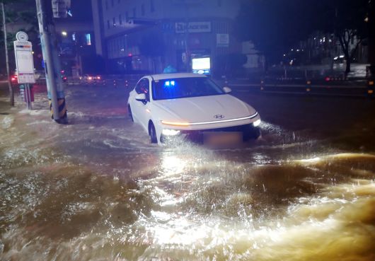 호우경보가 발효된 13일 오후 부산 사상구의 한 도로가 침수돼 택시가 힘겹게 이동하고 있다. |