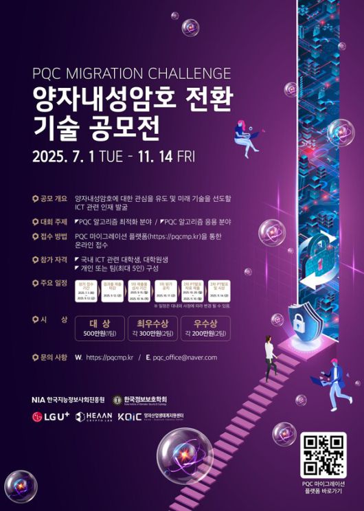 PQC 통합 서비스는 개발자가 기존 시스템에 손쉽게 PQC 기술을 적용할 수 있도록 라이브러리 및 API를 제공한다. 공모전 접수는 9월 12일까지 진행되며, 참가자는 마감 기한까지 PQC 마이그레이션 플랫폼 누리집에 결과물을 제출해야 한다.