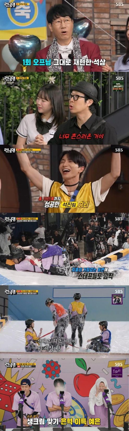 한편, 이날 레이스에는 슈퍼주니어 이특, 규현, 은혁도 데뷔 해인 2005년 당시 입었던 착장으로 함께 하며 ‘런닝맨’ 방송 15주년을 축하했다. 본격적인 레이스는 재석 팀, 석진 팀으로 나뉘어 돌입했고 첫 게임은 ‘매운맛 의리게임’을 진행했다.