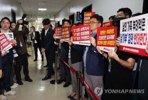 (서울=연합뉴스) 김주성 기자 = 국민의힘 보좌진협의회 소속 보좌관들이 강선우 여성가족부 장관 후보자의 인사청문회가 열리는 14일 국회 여성가족위원회 청문회장 앞에서 사퇴를 촉구하는 피켓시위를 하고 있다. 2025.7.14