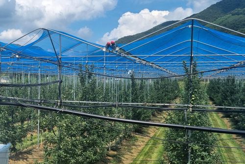햇빛 차단망은 사과밭 전체를 덮어 씌워 햇빛 투시율을 낮추는 시설이다.