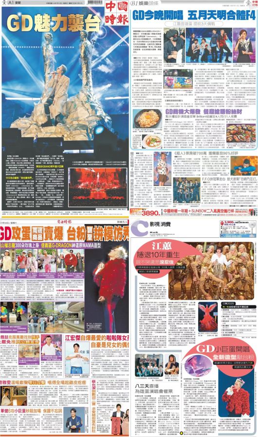 대만은 지드래곤의 공연을 집중 조명했다. 메이저 TV 뉴스 등 현지 매체는 입국과 콘서트, 전시 등을 상세히 보도했다. 공연 전부터 뜨거운 관심을 보였다.