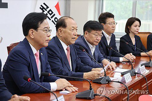 (서울=연합뉴스) 국민의힘 황우여 선거관리위원회 위원장(왼쪽 두번째)이 14일 국회에서 열린 당 대표 및 최고위원 선출 선거관리위원회 위촉장 수여식에서 발언하고 있다. 2025.7.14 [국민의힘 제공. 재판매 및 DB 금지]