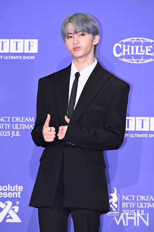 (MHN 이현지 기자) 그룹 엔시티 드림(NCT DREAM) 마크가 14일 오전 서울 송파구 롯데시네마 월드타워점에서 진행된 정규 5집 'Go Back To The Future'(고 백 투 더 퓨처) 제작발표회에서 포토타임을 갖고 있다.