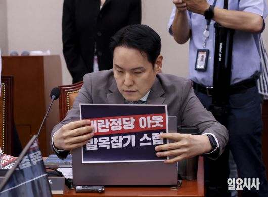 김한규 국회 여성가족위원회 여당 간사가 14일 서울 여의도 국회에서 열린 강선우 여성가족부 장관 후보자 인사청문회에서 국민의힘을 규탄하는 내용의 피켓을 걸고 있다.