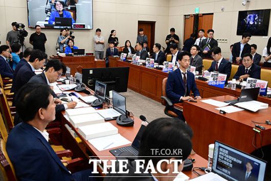 [더팩트ㅣ국회=남윤호 기자] 국민의힘 소속 의원들이 14일 오전 서울 여의도 국회에서 배경훈 과학기술정보통신부 장관 후보자의 인사청문회에 앞서 '최민희 독재 OUT, 이재명은 협치하라!'라고 적힌 피켓을 내걸고 있다.