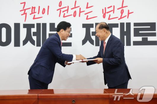 (서울=뉴스1) = 송언석 국민의힘 비상대책위원장 겸 원내대표가 14일 오전 서울 여의도 국회에서 열린 당 대표 및 최고위원 선출 선거관리위원회 위촉장 수여식에서 황우여 선관위원장에게 위촉장을 수여하고 있다. (국민의힘 제공) 2025.7.14/뉴스1skitsch@news1.krCopyright ⓒ 뉴스1. All rights reserved. 무단 전재 및 재배포, AI학습 이용 금지.