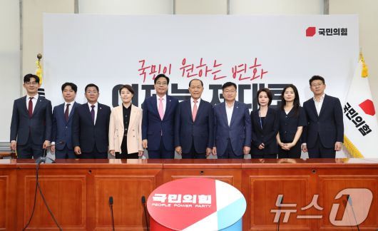 (서울=뉴스1) = 송언석 국민의힘 비상대책위원장 겸 원내대표가 14일 오전 서울 여의도 국회에서 열린 당 대표 및 최고위원 선출 선거관리위원회 위촉장 수여식에서 황우여 선관위원장 등 선관위원들과 기념촬영을 하고 있다. (국민의힘 제공) 2025.7.14/뉴스1