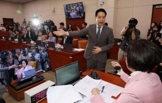 14일 국회 여성가족위원회에서 열린 강선우 여성가족부 장관 후보자 인사청문회에서 김한규 여당 간사가 이인선 위원장에게 항의하고 있다. <ⓒ투자가를 위한 경제콘텐츠 플랫폼, 아시아경제(www.asiae.co.kr) 무단전재 배포금지>