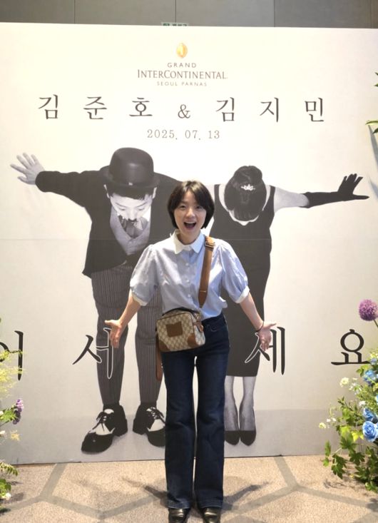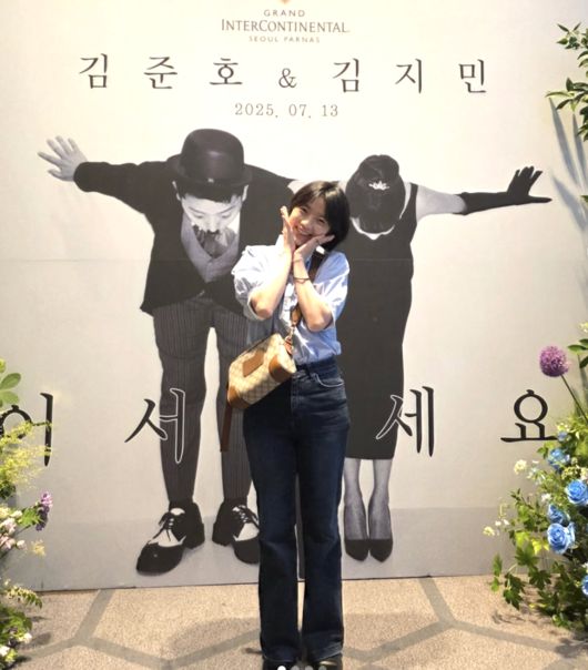사진 속 안영미는 서울 삼성동 그랜드인터컨티넨탈 파르나스 웨딩홀에 마련된 포토월 앞에서 밝은 표정으로 기념 포즈를 취하고 있다. 김준호·김지민이 함께 절하는 웨딩 포스터 앞에서 안영미도 같은 자세로 유쾌하게 응답해, 개그계 특유의 따뜻하고 유머 넘치는 분위기를 자아냈다.