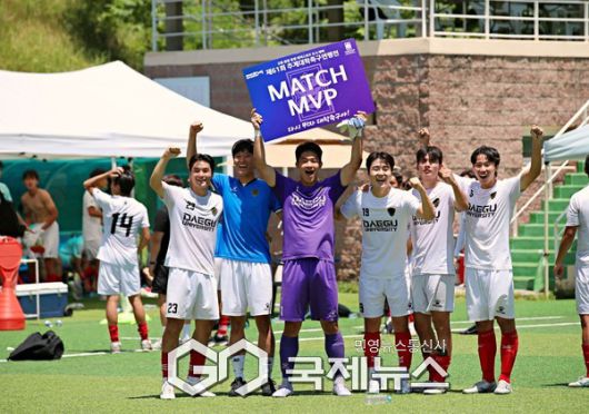 (태백=국제뉴스) 김병용 기자 = 이태홍 감독이 이끄는 대구대학교축구부가 승부차기 혈투 끝에 호원대를 꺾고 백두대간기 첫 우승에 성큼 한걸음 더 다가섰다.