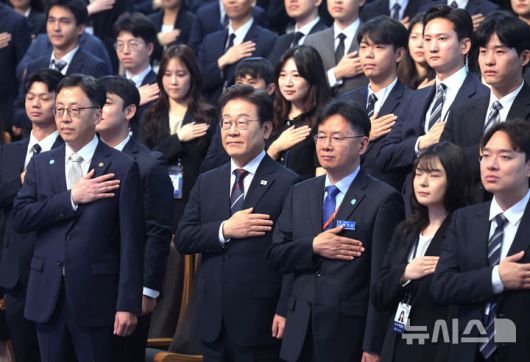 [진천=뉴시스] 최동준 기자 = 이재명 대통령이 14일 충북 진천 국가공무원인재개발원에서 5급 신임관리자과정 교육생에게 특강에 앞서 참석자들과 국민의례를 하고 있다. (대통령실통신사진기자단) 2025.07.14. photocdj@newsis.com