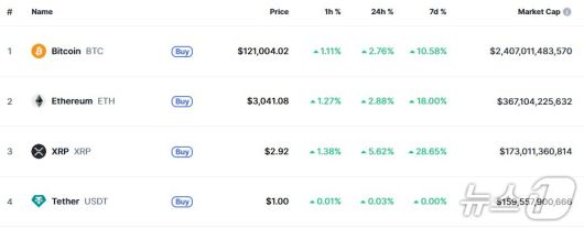 14일 오후 1시 현재 글로벌 코인 시황 중계사이트인 코인마켓캡에서 비트코인은 24시간 전보다 2.76% 상승한 12만1004달러를 기록하고 있다.
