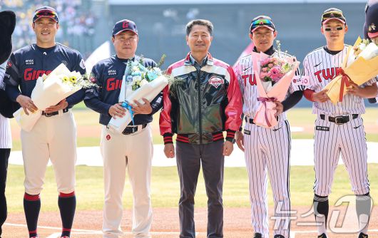 LG 스포츠 김인석 대표이사가 22일 서울 송파구 잠실야구장에서 열린 '2025 신한 SOL 뱅크 KBO리그' 개막전 롯데 자이언츠와 LG 트윈스의 경기에 LG염경엽 감독과 롯데 김태형 감독에게 꽃다발을 전달 후 기념촬영 하고 있다. 2025.3.22/뉴스1 ⓒ News1 김도우 기자 |