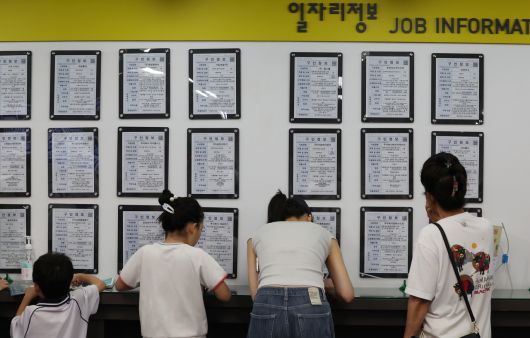 고용노동부가 26일 발표한 ‘2025년 상반기 직종별 사업체노동력조사 결과’에 따르면 4월 1일 기준 부족 인원은 46만9000명으로 전년 동기보다 10.0%(5만2000명) 줄었다. 이에 올해 2∼3분기 채용계획인원도 47만명으로 9.7%(5만1000명) 감소했다. 사진은 이날 서울 마포구 서부고용복지플러스센터 일자리 정보 게시판 모습. [연합] |