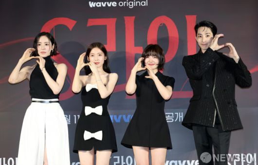 [서울=뉴스핌] 정일구 기자 = 배우 이다희, 아린, 이은샘, 이수혁이 7일 오후 서울 용산구 CGV 용산아이파크몰에서 열린 웨이브 오리지널 드라마 'S라인' 언론시사회 및 제작발표회에서 포즈를 취하고 있다. 'S라인'은 성적 관계를 맺은 사람들 사이에 연결된 붉은 선, 일명 S라인이 보이기 시작하면서 감춰졌던 진실과 금지된 욕망이 드러나는 판타지 스릴러 드라마다. 2025.07.07 mironj19@newspim.com |